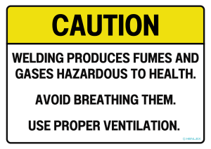 This caution sign warns about the toxic fumes and gases produced during welding. It advises individuals to avoid breathing these hazardous substances and to ensure proper ventilation in the welding area.