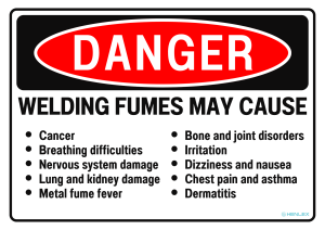 The last sign provides a detailed list of the dangers associated with welding fumes. It serves as an educational tool to inform welders and others about the health risks of prolonged exposure to these fumes.